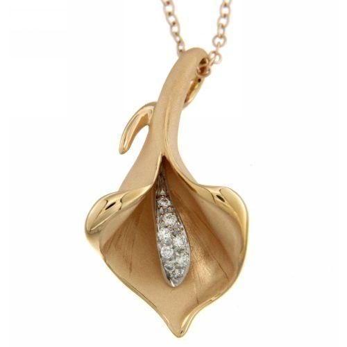 Girocollo Annamaria Cammilli, collezione Calla - Pendente in oro rosa satinato, colore arancio, con incastonati diamanti taglio brillante per un tot di Kt 0,09 VS1-G - Made in Italy Calla, il fiore icona del brand, è caratterizzata da immancabili giochi dati dalla finitura Aetherna che conferiscono profondità e movimento al fiore. La riproduzione di armoniosi movimenti naturali rendono il gioiello unico nel suo genere.