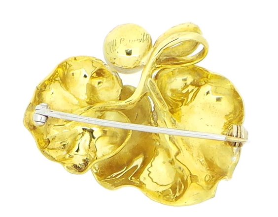Spilla/Ciondolo in oro giallo e bianco 750/°°° con Perla Akoya 8 mm e diamanti taglio brillante ct 0.11 complessivi, colore "G" purezza "VS1" - peso g 13.70 totali - prodotto artigianale numerato