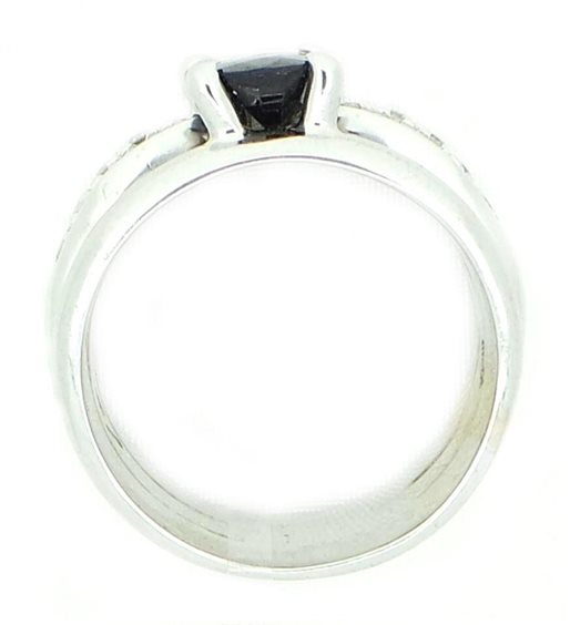 Anello in oro bianco e giallo 750/°°° con zaffiro naturale taglio ovale ct approssimativi 1,80 e diamanti taglio brillante, colore G purezza SI, peso ct 0,11 complessivi, il peso totale del gioiello è di g. 11,50