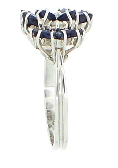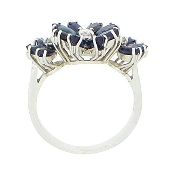 Anello floreale in oro bianco 750/°°° con zaffiri taglio "navette" ct 0.74 e diamanti taglio brillante ct 0.08 complessivi . Peso g. 4.80 . Si può avere a misura dal 15 al 22 . Gioiello realizzato negli anni '70.