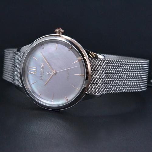 Orologio Citizen solo tempo donna Collezione Citizen Lady - codice:EM0816-88Y. Movimento Eco-Drive a carica luce con riserva di carica di 8 mesi. Cassa e bracciale in acciaio, quadrante in madreperla rosa con indici e lancette rosè. Vetro zaffiro antigraffio. Resistente all'acqua (water resistant) 5 atm (50m). Diametro cassa 32 mm, spessore 8 mm. Peso 46 gr. Bracciale in acciaio a "maglia milano" con chiusura deployante in acciaio.