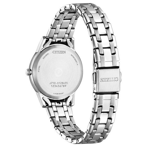 Orologio donna solo tempo collezione Citizen Lady. Cassa in acciaio lucido e satinato. Movimento Eco-Drive a carica luce con riserva di carica di 180 giorni. Vetro minerale. Quadrante bianco con 6 cristalli applicati, lancette luminescenti con cifre romane blu inchiostro, data a ore 3. Bracciale regolabile in acciaio lucido e satinato, chiusura deployante con pulsanti. Impermeabile 10 atm. Scatola istruzioni garanzia 2 anni originali.