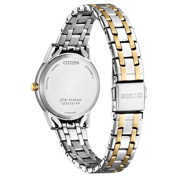 Orologio donna solo tempo collezione Citizen Lady. Cassa in acciaio lucido e satinato , lunetta e corona placcate oro rosa. Movimento Eco-Drive a carica luce con riserva di carica di 180 giorni. Vetro minerale. Quadrante silver con 6 cristalli applicati, lancette luminescenti con cifre romane lucide oro rosa, data a ore 3. Bracciale bicolore regolabile in acciaio lucido e satinato, chiusura deployante con pulsanti. Impermeabile 5 atm. Scatola istruzioni garanzia 2 anni originali.