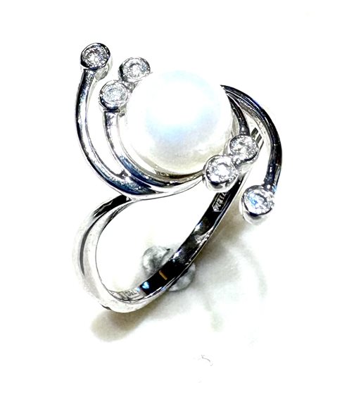 Anello in oro bianco 18Kr con perla coltivata asiatica d'acqua dolce mm 7/7,5 e 6 diamanti taglio brillante