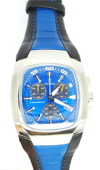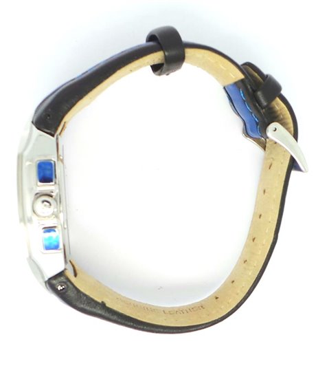 Orologio unisex cassa in acciaio lucida e satinata, a forma rettangolare mm 39 x 49. Movimento al quarzo, cronografo. Quadrante blu elettrico con indici e datario. Resistente all'acqua fino a 100 metri. Cinturino ergonomico in pelle bicolore nero e blu. Fondello serrato a vite