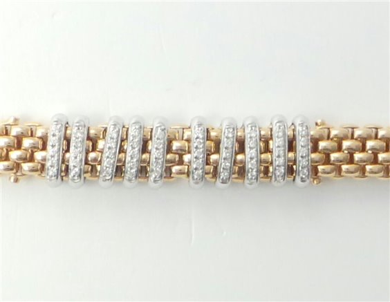 Bracciale maglia tradizionale Fope morbida,in oro rosa 18ct. Parte centrale con inserti in oro bianco e diamanti taglio brillante ct 0,44. Larghezza maglia 9mm, lunghezza 18,5 cm. Chiusura a scatto con sicura. Prodotto nuovo con garanzia di autenticità.