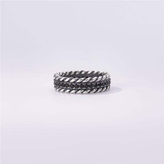 Anello uomo , argento 925% brunitO, lavorazione torchon , zirconi neri incastonati con griffe. Scatola e garanzia originali.