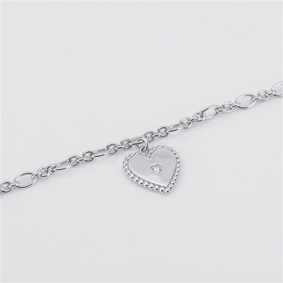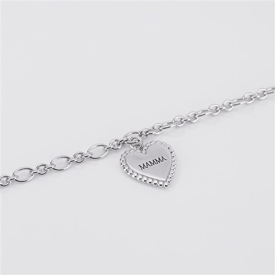 Bracciale argento rodiato con ciondolo cuore “MAMMA” e zirconi bianchi • Dimensione del cuore: 16 x 16,3 mm • Diametro degli zirconi:2 mm • Chiusura con moschettone • Misura regolabile, lunghezza da 16 a 19 cm • Materiale: Argento 925, zirconi