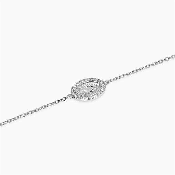 Bracciale regolabile in argento rodiato con catena rolò e ciondolo Madonnina con zircone. • Dimensione ciondolo: 14,2x11,1 mm • Diametro zircone: 1,2 mm • Diamensione catena: 1,4 mm • Misura regolabile, lunghezza da 16 a 19 cm • Materiale: Argento 925, Zircone