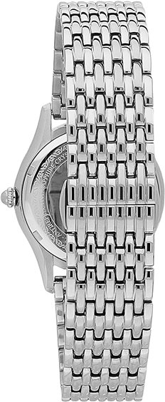 Orologio solo tempo da donna con movimento Ronda 505, datario ad ore 6 e indici con diamanti su sfondo blu. Il vetro è zaffiro. Il cinturino è in acciaio con double push buckle.