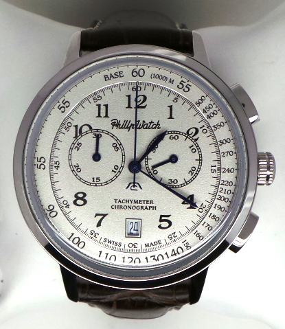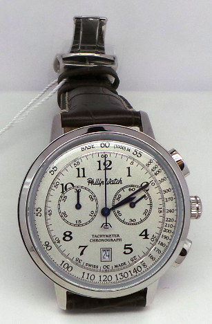 Orologio Philip Watch Grand Archive. Cassa mm 43 in acciaio, cinturino in pelle marrone stampato con chiusra deployante in acciaio. Quadrante avorio opaco con dettagli neri e lancette blu, datario al 6. Cronografo al quarzo, vetro zaffiro. Impermeabilità 3 atmosfere. SWISS MADE