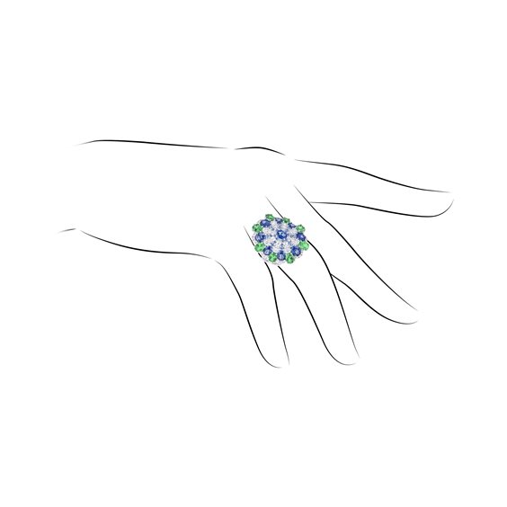 Anello d'alta gioielleria in oro bianco 18Kr con zaffiri Ceylon color "manto di Madonna" e tsavoriti (granati verdi) taglio ovale, ulteriormente impreziosito da ct 0.90 di diamanti F/VVS taglio brillante