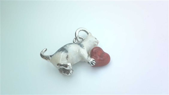 Ciondolo a forma di gattino che gioca con un cuore rosso in argento smaltato