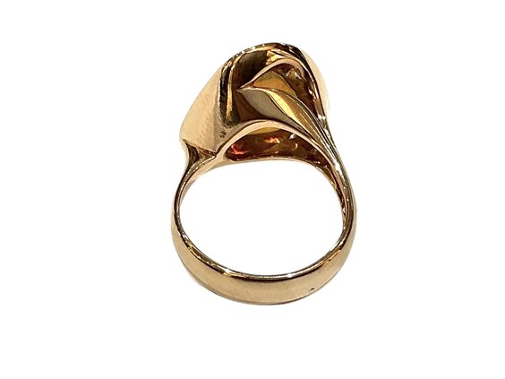 Anello in oro rosa 18Kr con Opale etiope di forma triangolare particolarmente ricco di giochi di colore, parzialmente circondato da diamanti taglio brillante. Realizzato interamente a mano