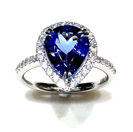 Anello in oro bianco 18Kr con tanzanite centrale tagliata a goccia circondata ed impreziosita da diamanti taglio brillante