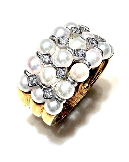 Anello a fascia in oro giallo e bianco 18Kr con 3 file di perle coltivate giapponesi Akoya distanziate da diamanti taglio brillante