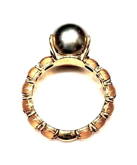 Anello in oro giallo 18Kr della collezione "Vulcano" dell'azienda Superoro con una grande perla grigia della Polinesia francese e quarzi citrini taglio cabochon lungo tutto il gambo dell'anello
