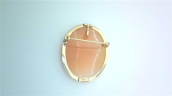 Spilla che può essere utilizzata anche come pendente in oro giallo 18Kr costituita da uno splendido cammeo realizzato rigorosamente a mano da abile incisore di Torre del Greco (Napoli) secondo la più antica tradizione del luogo, raffigurante il dio Marte (Ares). La forma è oval e misura 33X26 mm