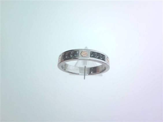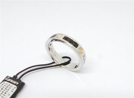 ANELLO DA UOMO A FORMA DI FEDE LARGHEZZA MM 4,55 IN ARGENTO LUCIDO E RODIATO SPINELLI NERI ED ELEMENTI IN ORO 750% IN ORO GIALLO. SE NON DISPONIBILE IN MISURE DIVERSE ORDINABILI IN 20 GIORNI