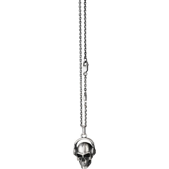 Collana in argento con cuffie e teschio. L'argento è trattato naturalmente con ossido di zolfo per rendere l'effetto vissuto del tempo.